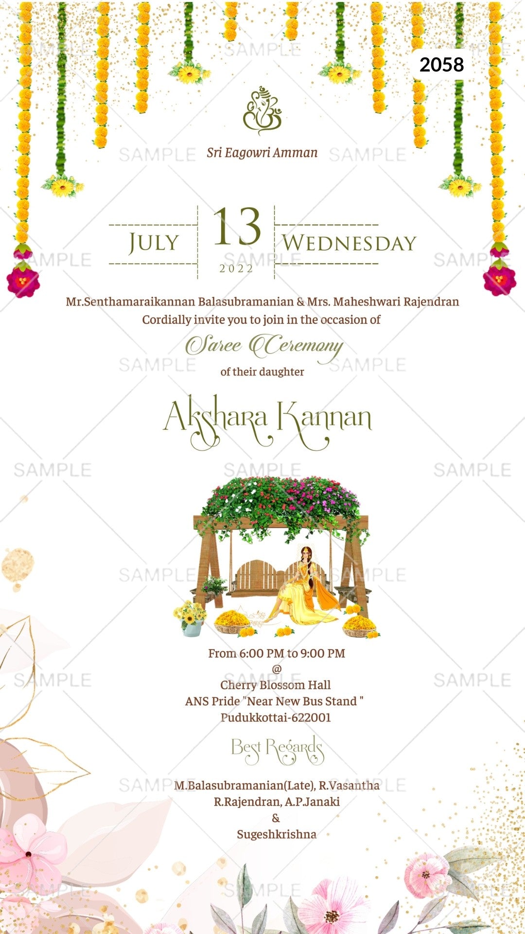 Half Saree ceremony invitation card Canva Editable Template in english language with floral theme design 2058