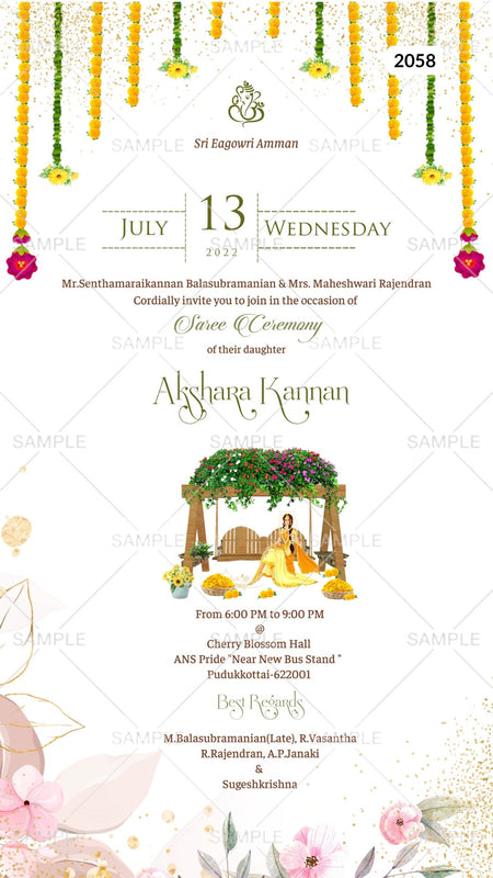 The floral Theme of half saree digital invitation Canva Editable Template in pink background color. This e-invite Editable Template is available in English language. It includes elements such as artistic flowers, swing, glitters, marigold flower hangings, and golden banana leaves. This Editable Template design can be customized online for free in Canva, and you can edit the function name, date, time, venue, and regards. You can also share your card easily via WhatsApp or email.