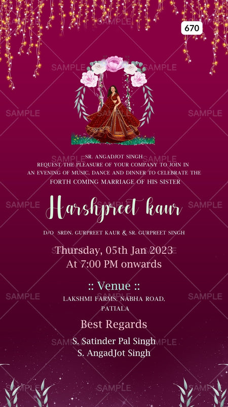 The glittery Theme of half saree digital invitation Canva Editable in pink background color. This e-invite Editable Template is available in English language. It includes elements such as dandelions, hanging string lights, girl doodle, sparkles, and flower frame. This card design can be customized online for free in Canva, and you can edit the function name, date, time, venue, and regards. You can also share your card easily via WhatsApp or email.