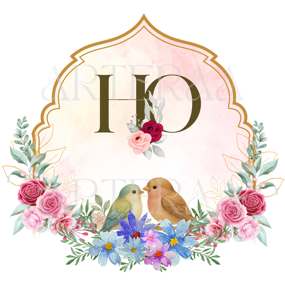 A: You will receive 5 high-resolution PNG files with transparent backgrounds featuring the selected couple initials (e.g., HO). The files are ready to use in digital or printed wedding materials.