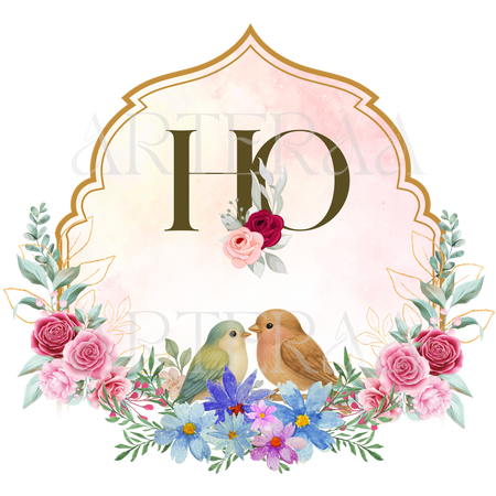 Royal Arch Frame with Love Birds – Luxurious floral arrangement with birds under a Mughal-style arch — perfect for regal invitations.
