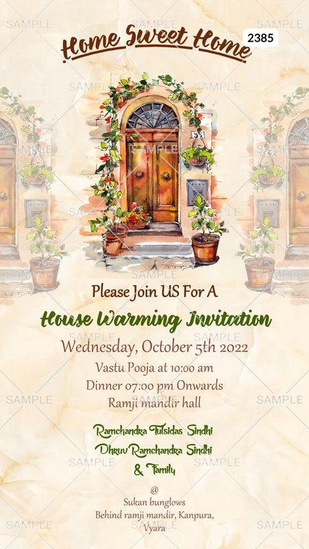 House Warming ceremony invitation card Canva Editable Template in english language with door, flowers pot as vintage theme design 2385