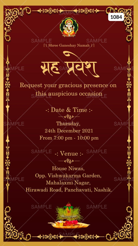 The minimalistic Theme of House Warming ceremony digital invitation Canva Editable in brown background color. This e-invite editable template is available in English language. It includes elements such as golden border, Kalash, and Ganesh image. This card design can be customized online for free in Canva, and you can edit the date, time, function name and venue. You can also share your card easily via WhatsApp or email.