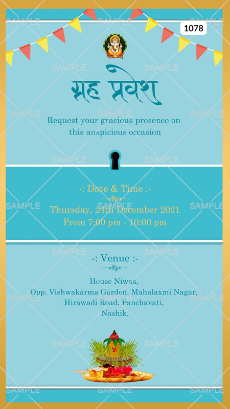 The minimalistic Theme of House Warming ceremony digital invitation Canva Editable in yellow and blue background color. This e-invite Editable Template is available in english language. It includes elements such as kalash, toran, door lock and ganesha logo. This Editable Template design can be customized online for free in Canva, and you can edit the function name, date, time, venue, and regards. You can also share your card easily via WhatsApp or email.