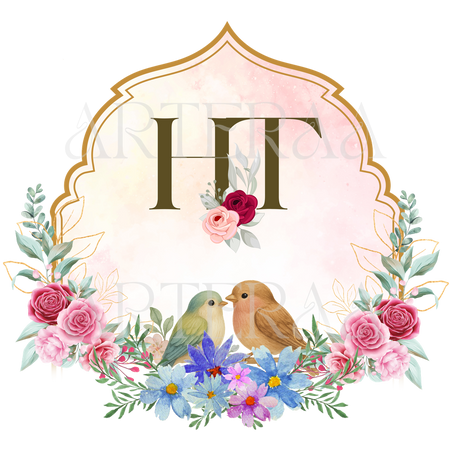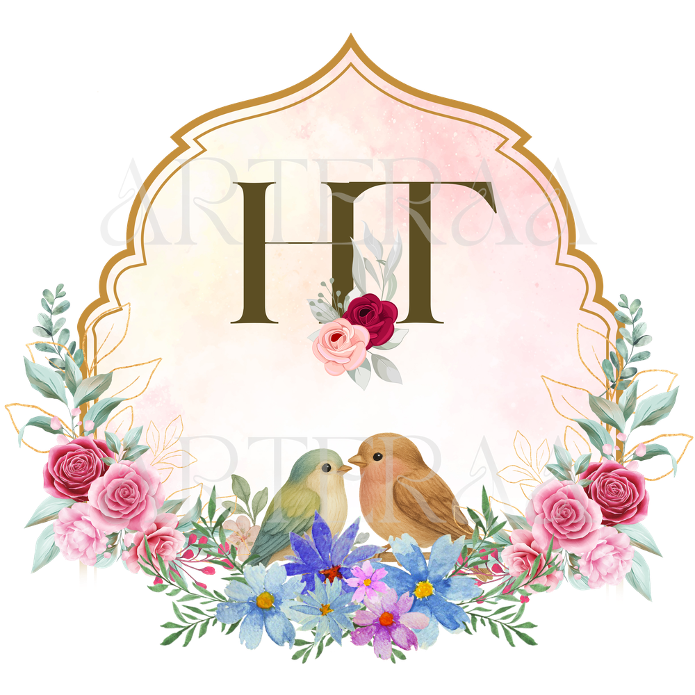 A: You will receive 5 high-resolution PNG files with transparent backgrounds featuring the selected couple initials (e.g., HT). The files are ready to use in digital or printed wedding materials.