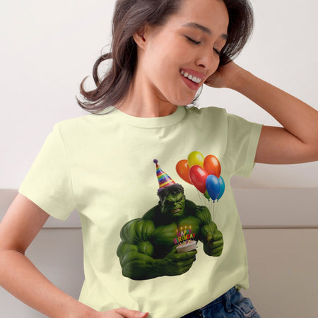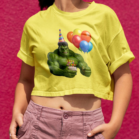 • A cute and angry Hulk wearing a party hat
