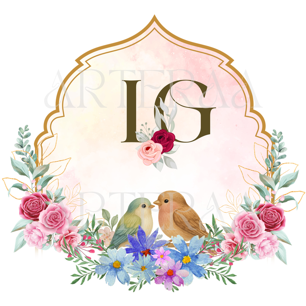 A: You will receive 5 high-resolution PNG files with transparent backgrounds featuring the selected couple initials (e.g., IG). The files are ready to use in digital or printed wedding materials.