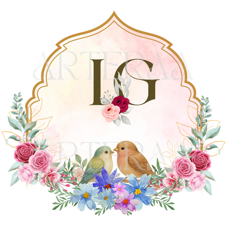 Royal Arch Frame with Love Birds – Luxurious floral arrangement with birds under a Mughal-style arch — perfect for regal invitations.