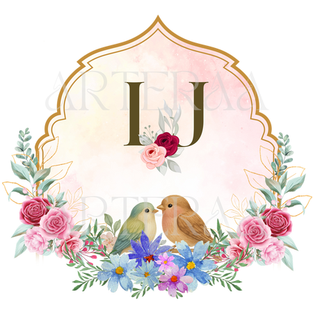 Royal Arch Frame with Love Birds – Luxurious floral arrangement with birds under a Mughal-style arch — perfect for regal invitations.