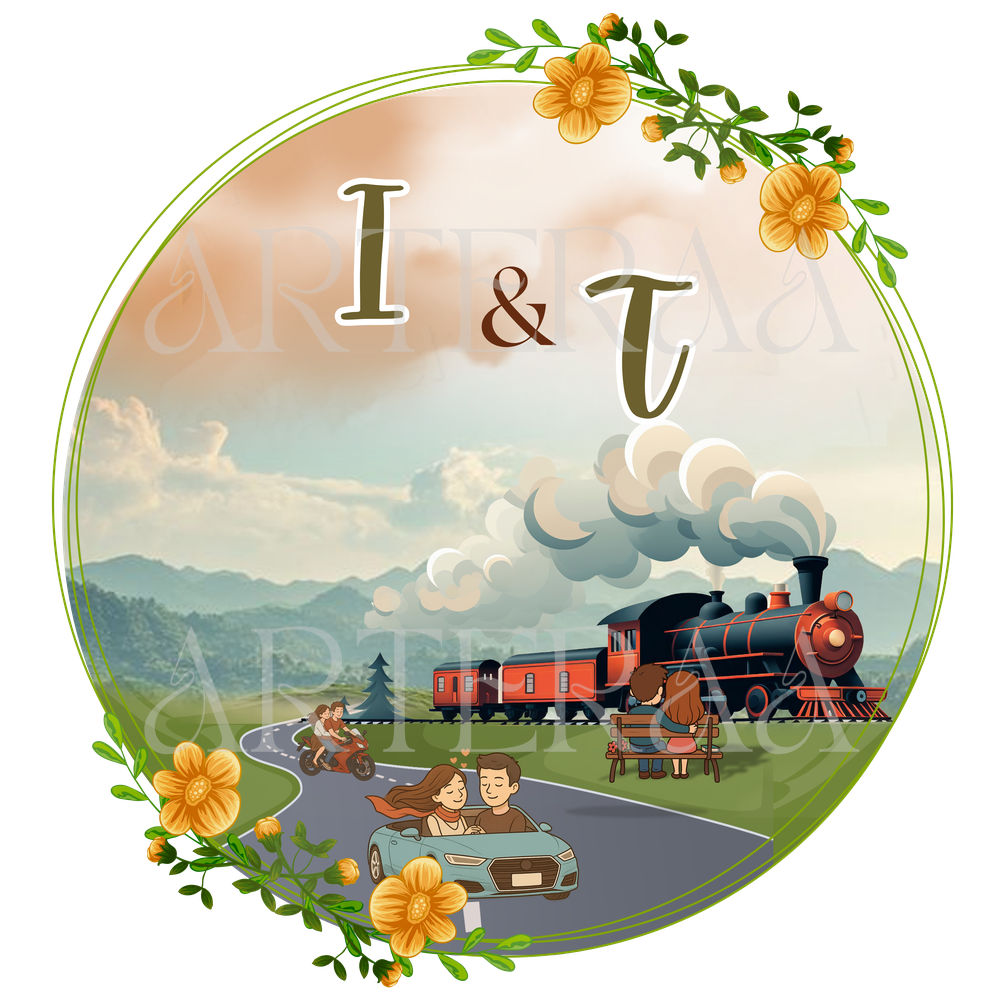 Travel & Train Theme – A whimsical couple’s journey with a scenic train, hills, and floral accents. Great for destination weddings!