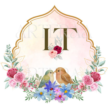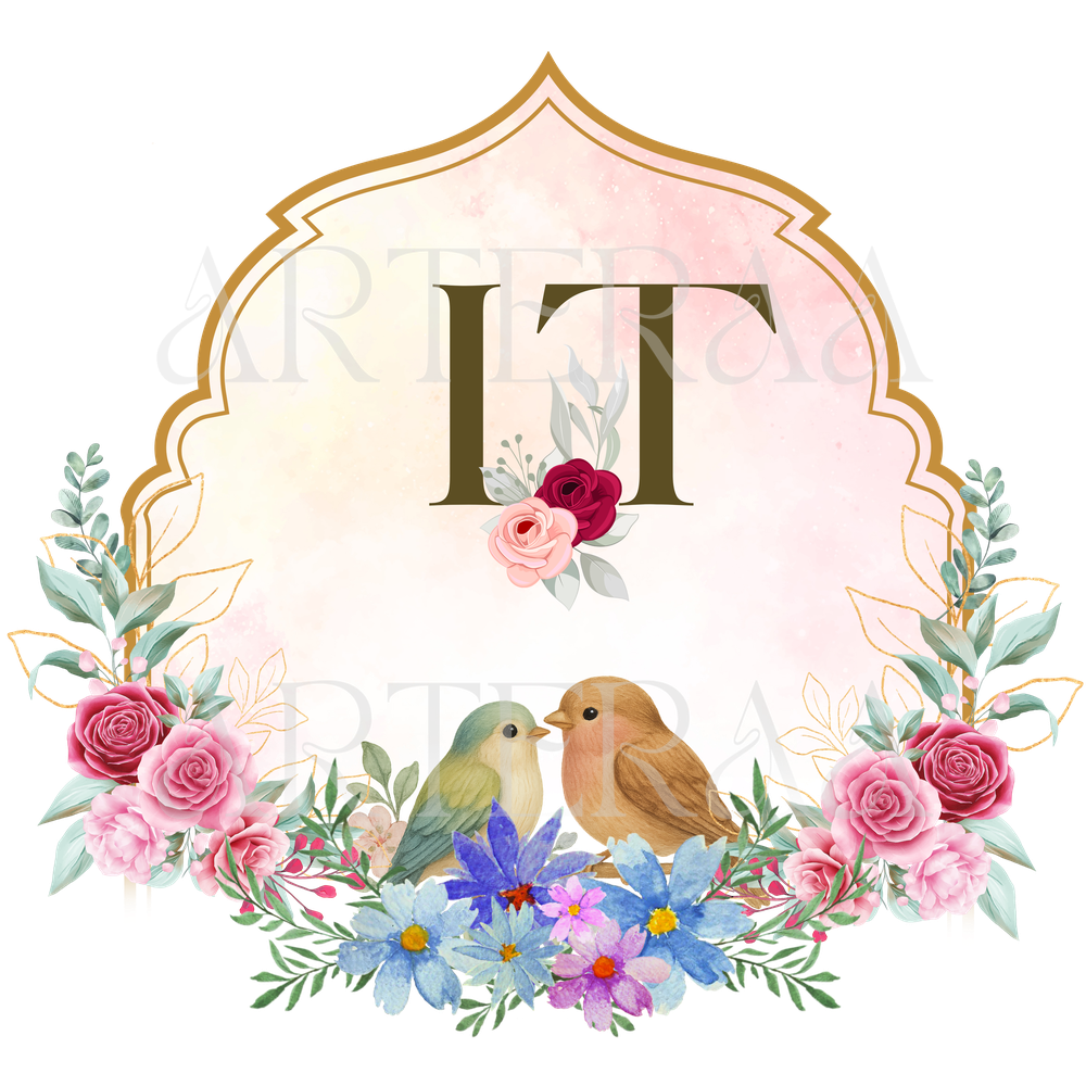 A: You will receive 5 high-resolution PNG files with transparent backgrounds featuring the selected couple initials (e.g., IT). The files are ready to use in digital or printed wedding materials.