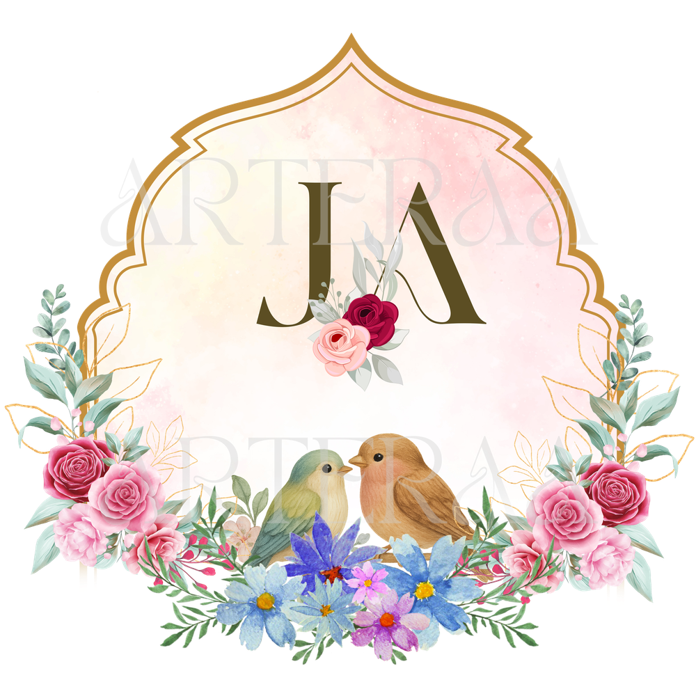 A: You will receive 5 high-resolution PNG files with transparent backgrounds featuring the selected couple initials (e.g., JA). The files are ready to use in digital or printed wedding materials.