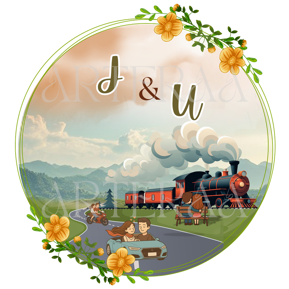 Travel & Train Theme – A whimsical couple’s journey with a scenic train, hills, and floral accents. Great for destination weddings!