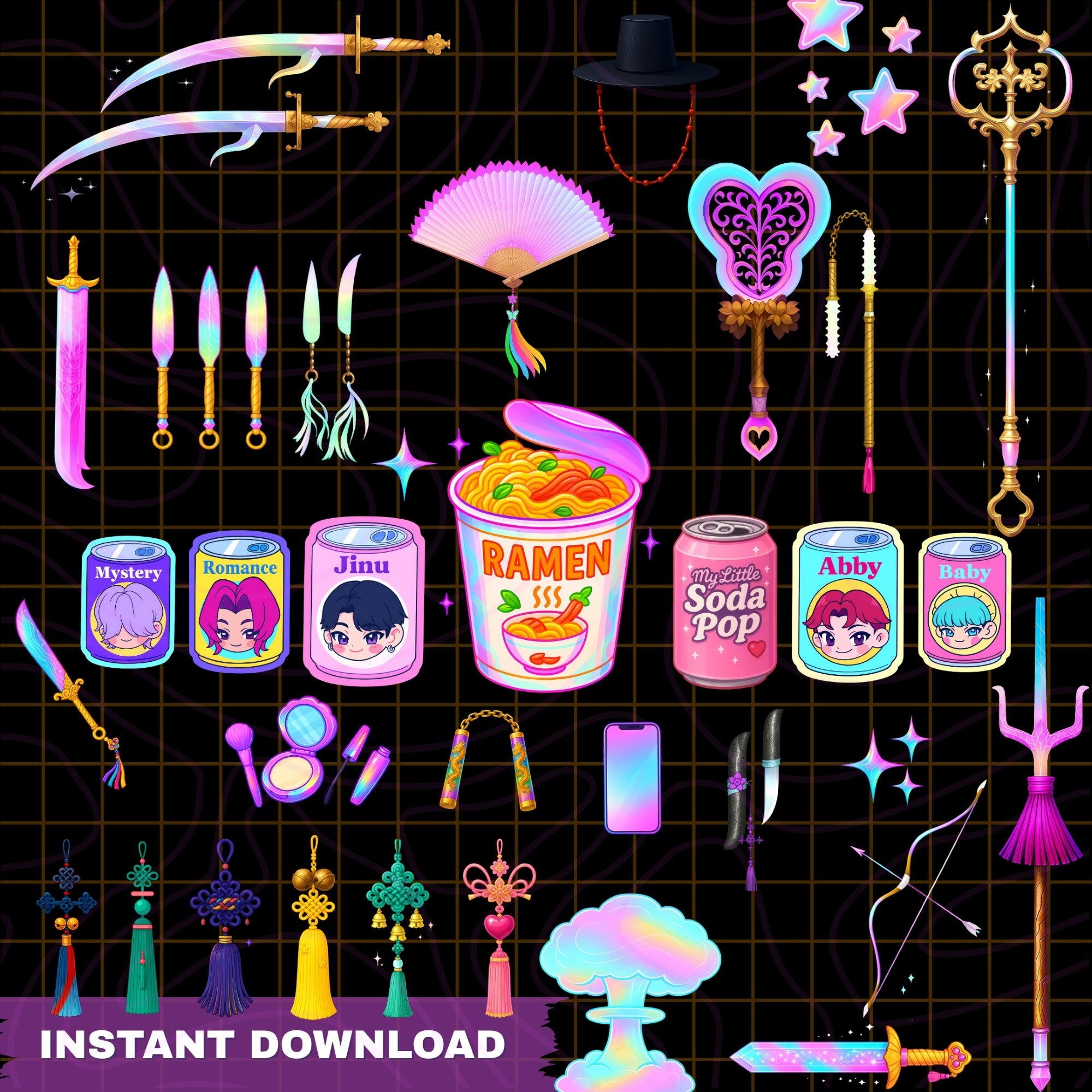 This unique digital collection is packed with 34 unique designs featuring a variety of manga-style weapons, trendy K-Pop-inspired sodas, and other fun elements like ramen and stars. Perfect for fans of anime and unique aesthetics, this bundle is ideal for creating custom stickers, apparel, and merchandise that stands out from the crowd.