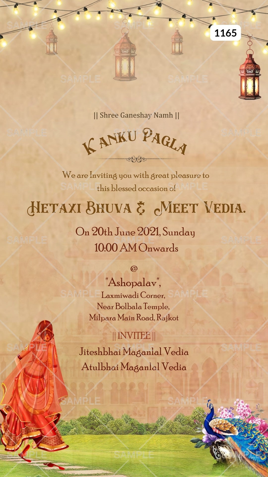 The vintage Theme of the Kanku Pagla Ceremony digital invitation Canva Editable is in brown background color. This e-invite editable template is available in the English language. It includes elements such as traditional girl doodle, peacock, lantern, and string lights. This card design can be customized online for free in Canva, and you can edit the name, date, time, function name and venue. You can also share your card easily via WhatsApp or email.