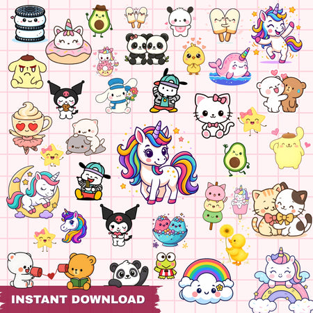 This massive digital collection features over 99 unique and adorable designs, including charming unicorns, pandas, cats, and many other cute characters. Perfect for adding a touch of whimsy and personality to your projects, this bundle is ideal for creating stickers, apparel, and decorations that are sure to delight.