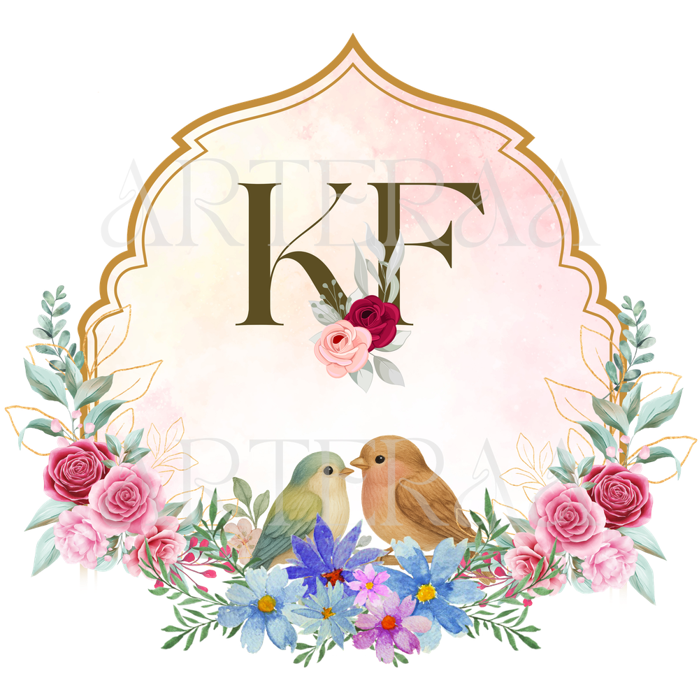 A: You will receive 5 high-resolution PNG files with transparent backgrounds featuring the selected couple initials (e.g., KF). The files are ready to use in digital or printed wedding materials.