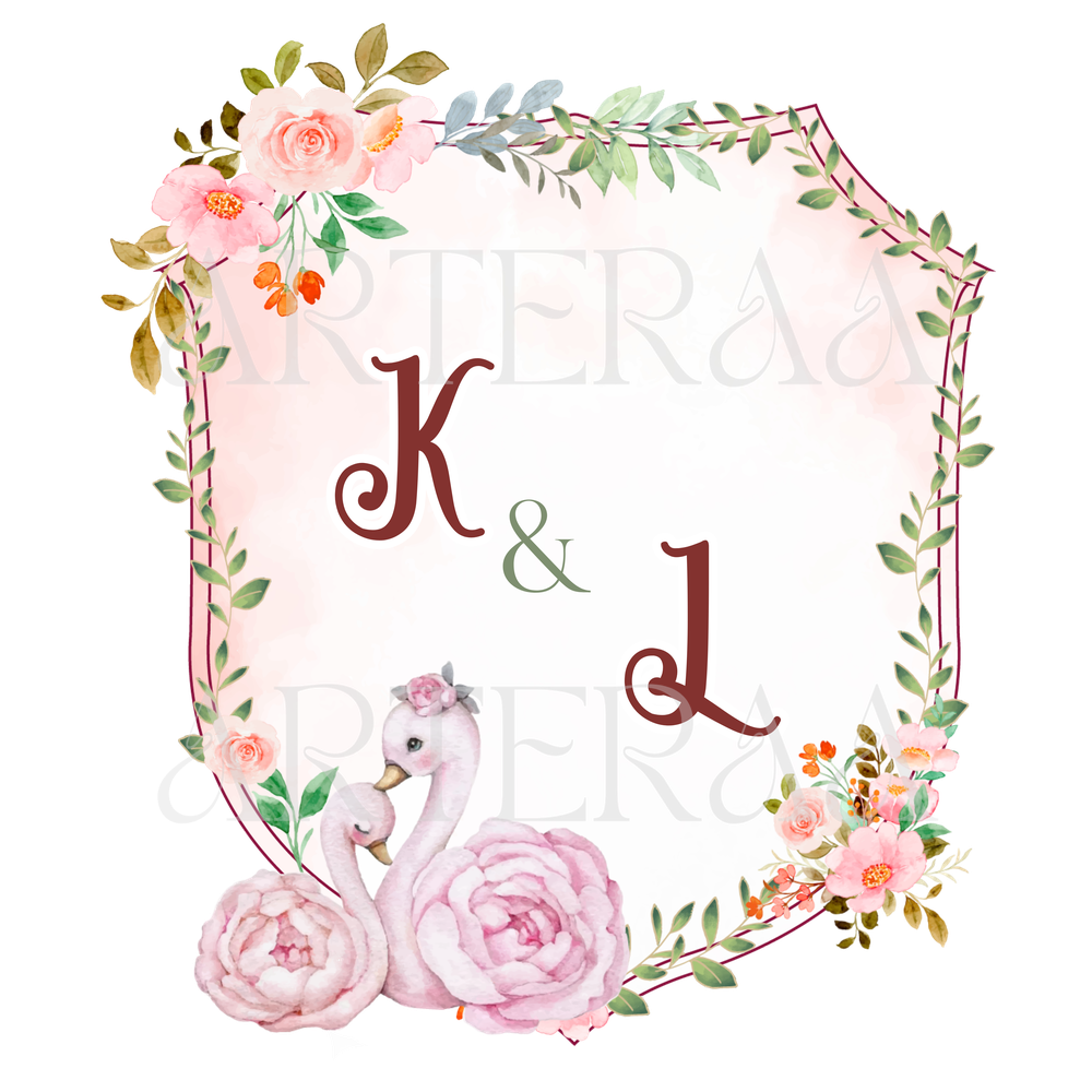 Floral Swan Monogram – Gentle pastel pinks, floral frame, and a pair of swans for an elegant romantic vibe.
