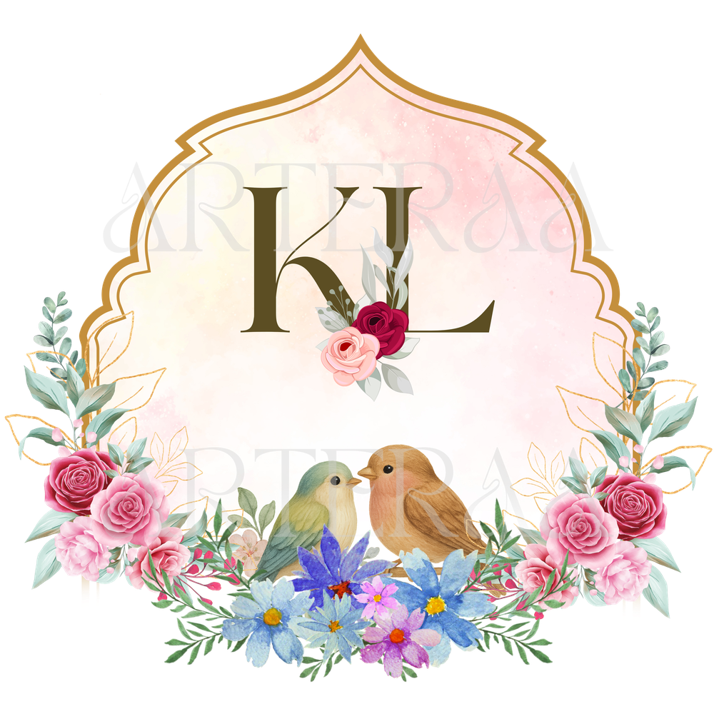 A: You will receive 5 high-resolution PNG files with transparent backgrounds featuring the selected couple initials (e.g., KL). The files are ready to use in digital or printed wedding materials.