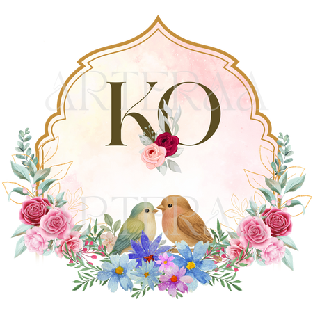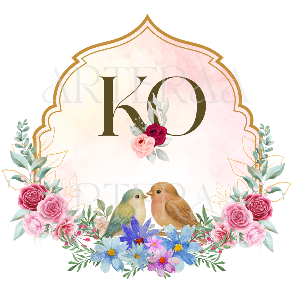 A: You will receive 5 high-resolution PNG files with transparent backgrounds featuring the selected couple initials (e.g., KO). The files are ready to use in digital or printed wedding materials.