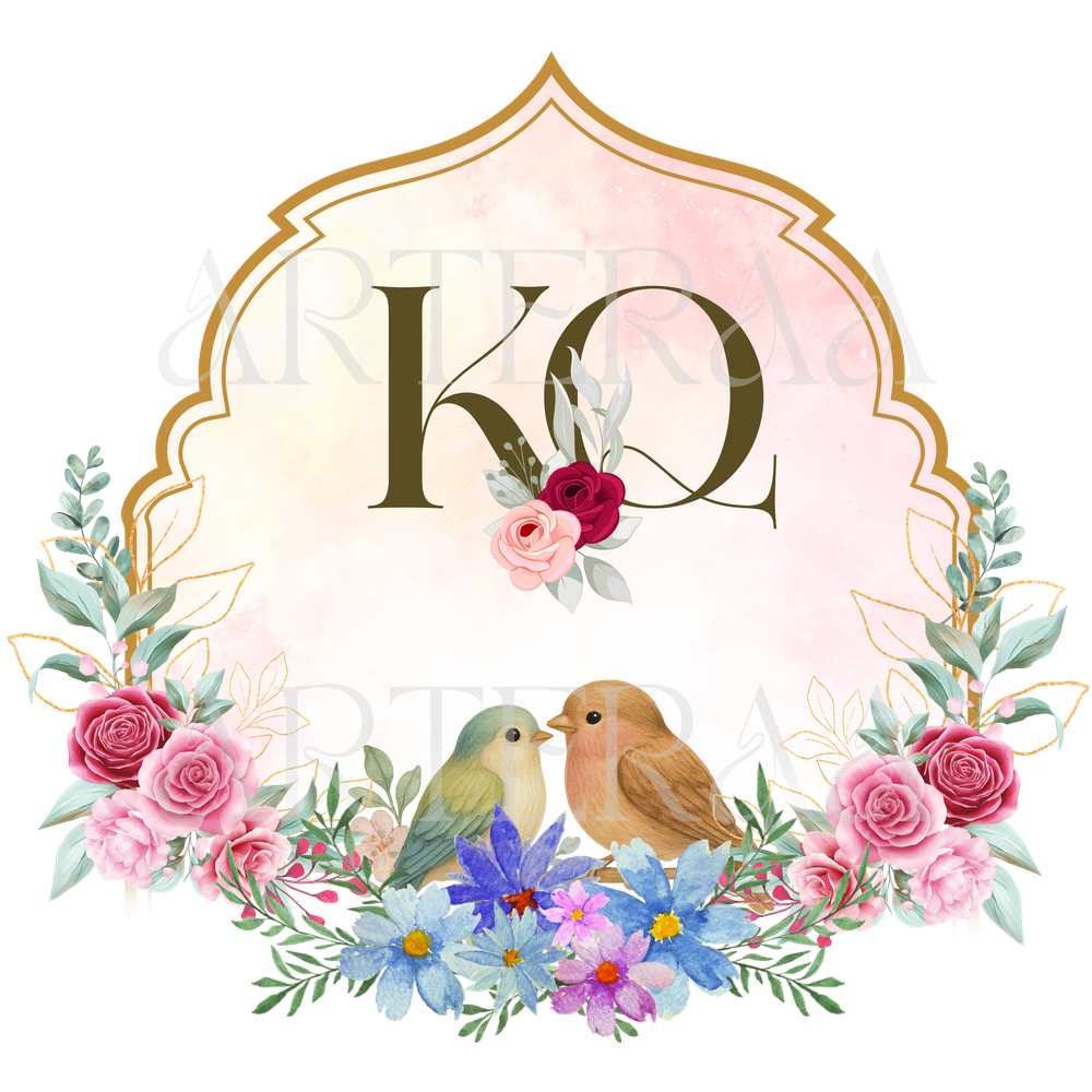 A: You will receive 5 high-resolution PNG files with transparent backgrounds featuring the selected couple initials (e.g., KQ). The files are ready to use in digital or printed wedding materials.