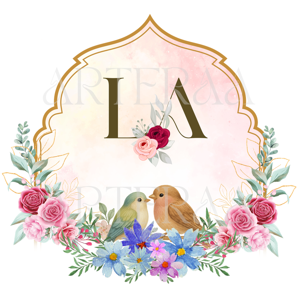 A: You will receive 5 high-resolution PNG files with transparent backgrounds featuring the selected couple initials (e.g., LA). The files are ready to use in digital or printed wedding materials.