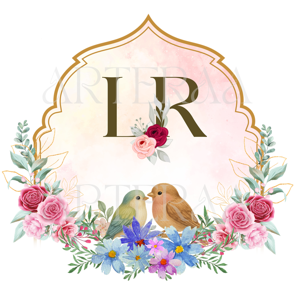 A: You will receive 5 high-resolution PNG files with transparent backgrounds featuring the selected couple initials (e.g., LR). The files are ready to use in digital or printed wedding materials.