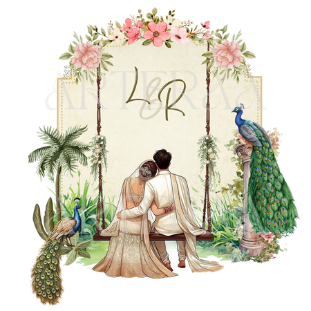 Traditional Indian Couple on Swing – Illustrated bride and groom sitting on a jhula surrounded by flowers and peacocks – timeless and cultural.