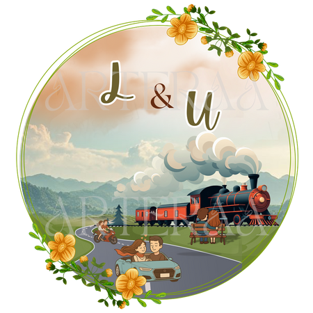 Travel & Train Theme – A whimsical couple’s journey with a scenic train, hills, and floral accents. Great for destination weddings!