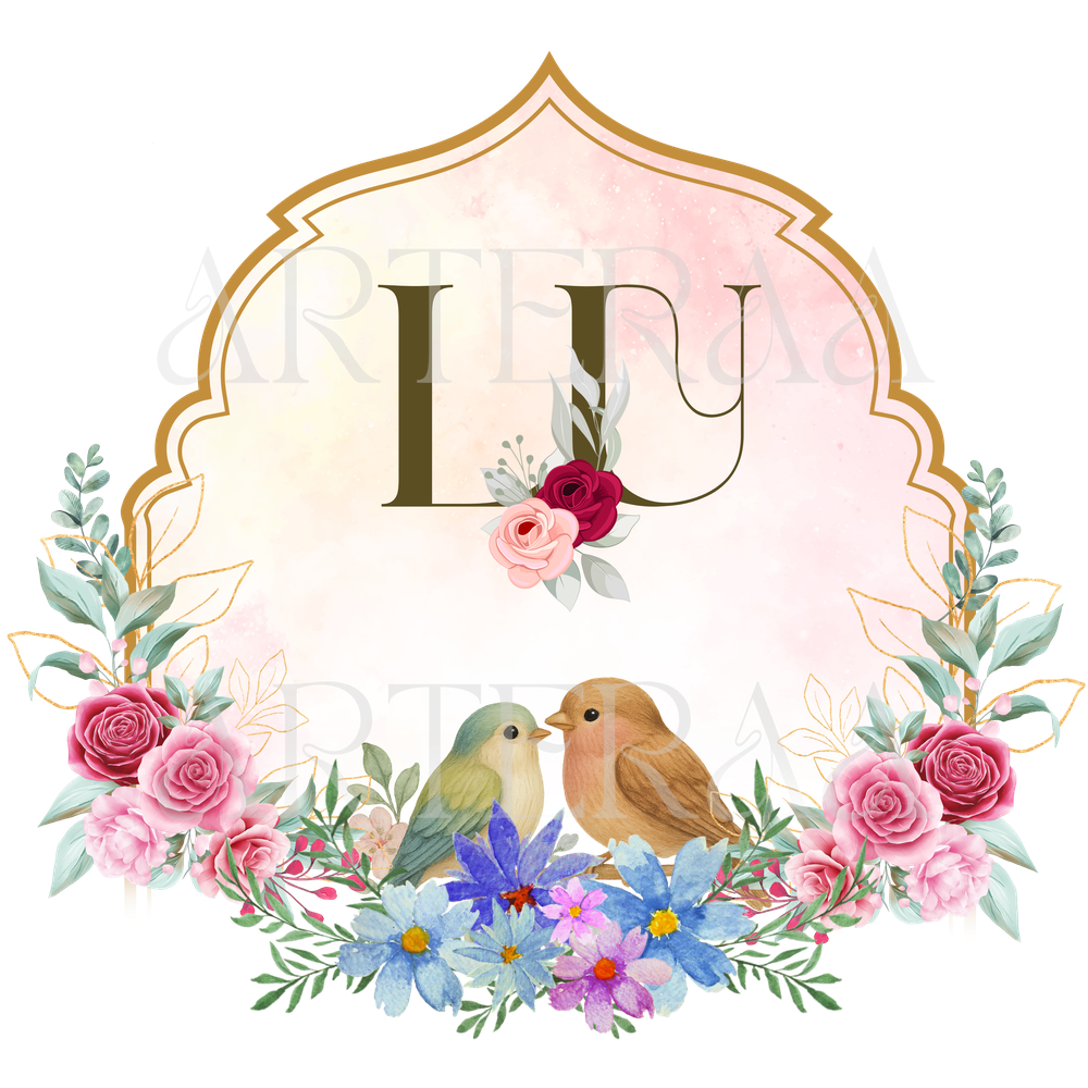 A: You will receive 5 high-resolution PNG files with transparent backgrounds featuring the selected couple initials (e.g., LU). The files are ready to use in digital or printed wedding materials.