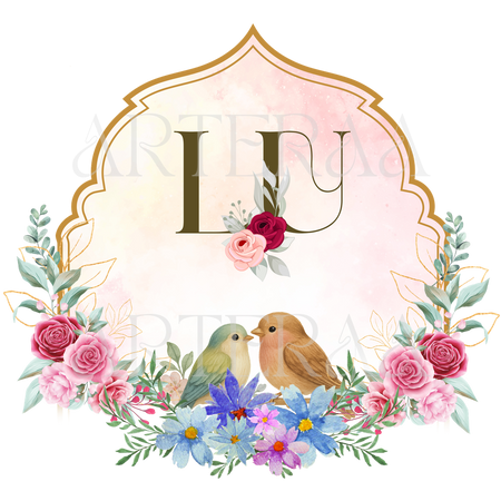 Royal Arch Frame with Love Birds – Luxurious floral arrangement with birds under a Mughal-style arch — perfect for regal invitations.