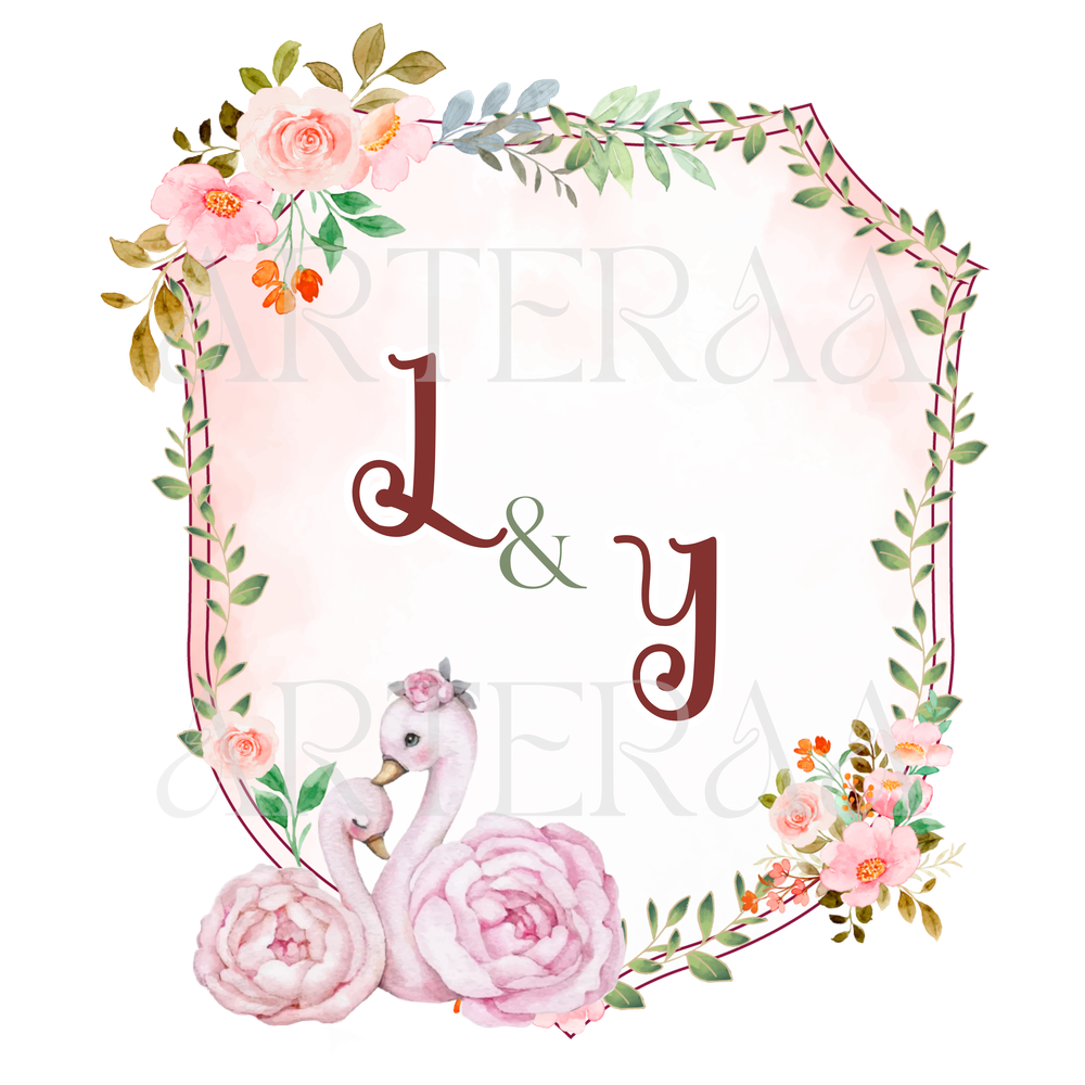 Floral Swan Monogram – Gentle pastel pinks, floral frame, and a pair of swans for an elegant romantic vibe.