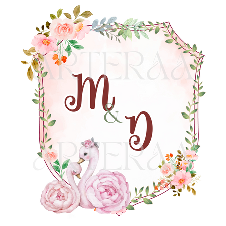 Floral Swan Monogram – Gentle pastel pinks, floral frame, and a pair of swans for an elegant romantic vibe.
