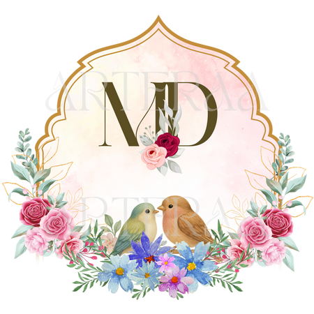 A: You will receive 5 high-resolution PNG files with transparent backgrounds featuring the selected couple initials (e.g., MD). The files are ready to use in digital or printed wedding materials.