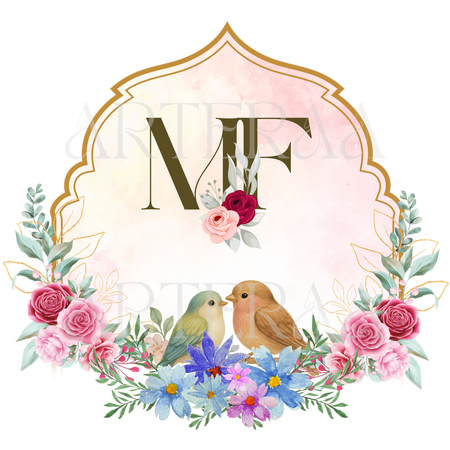 Royal Arch Frame with Love Birds – Luxurious floral arrangement with birds under a Mughal-style arch — perfect for regal invitations.