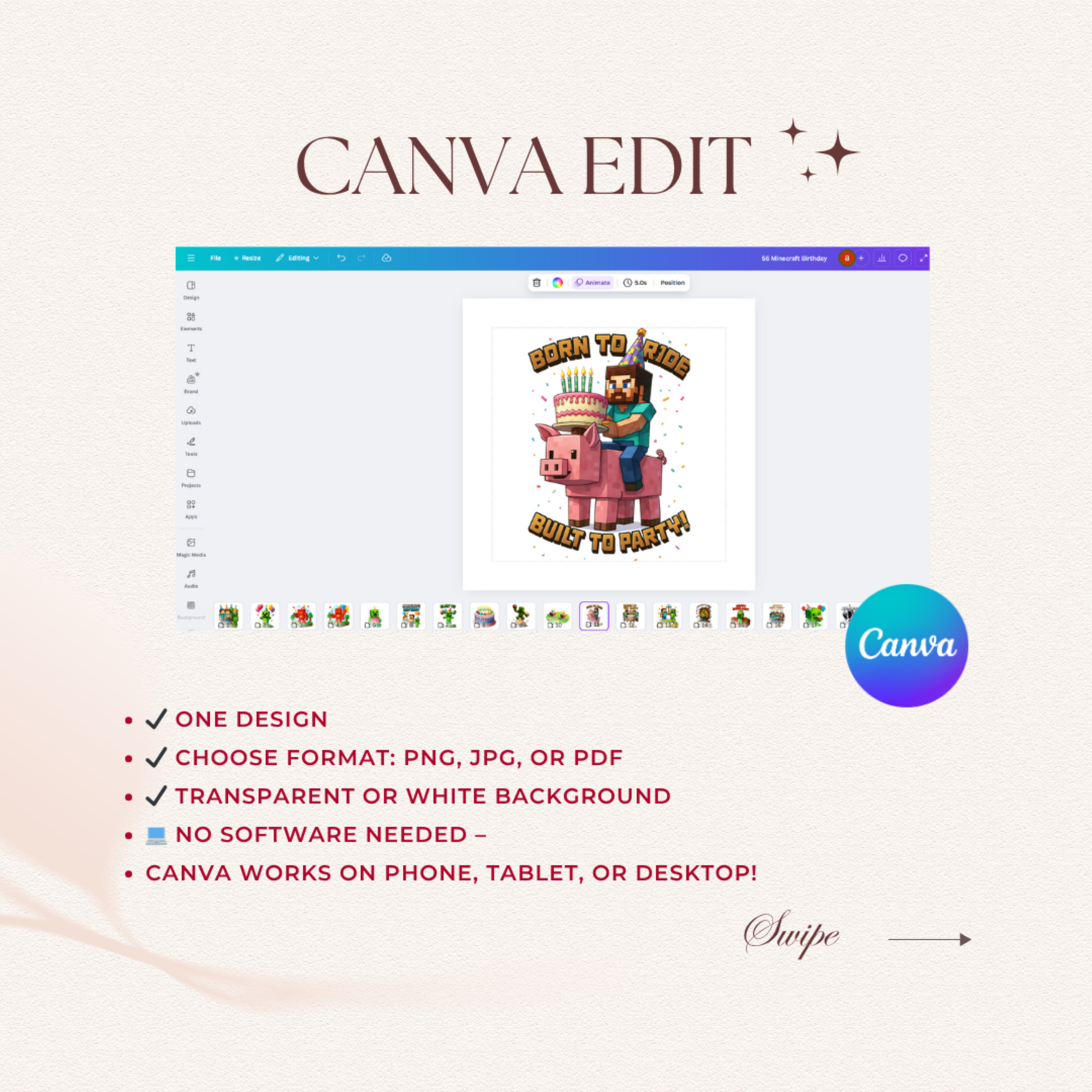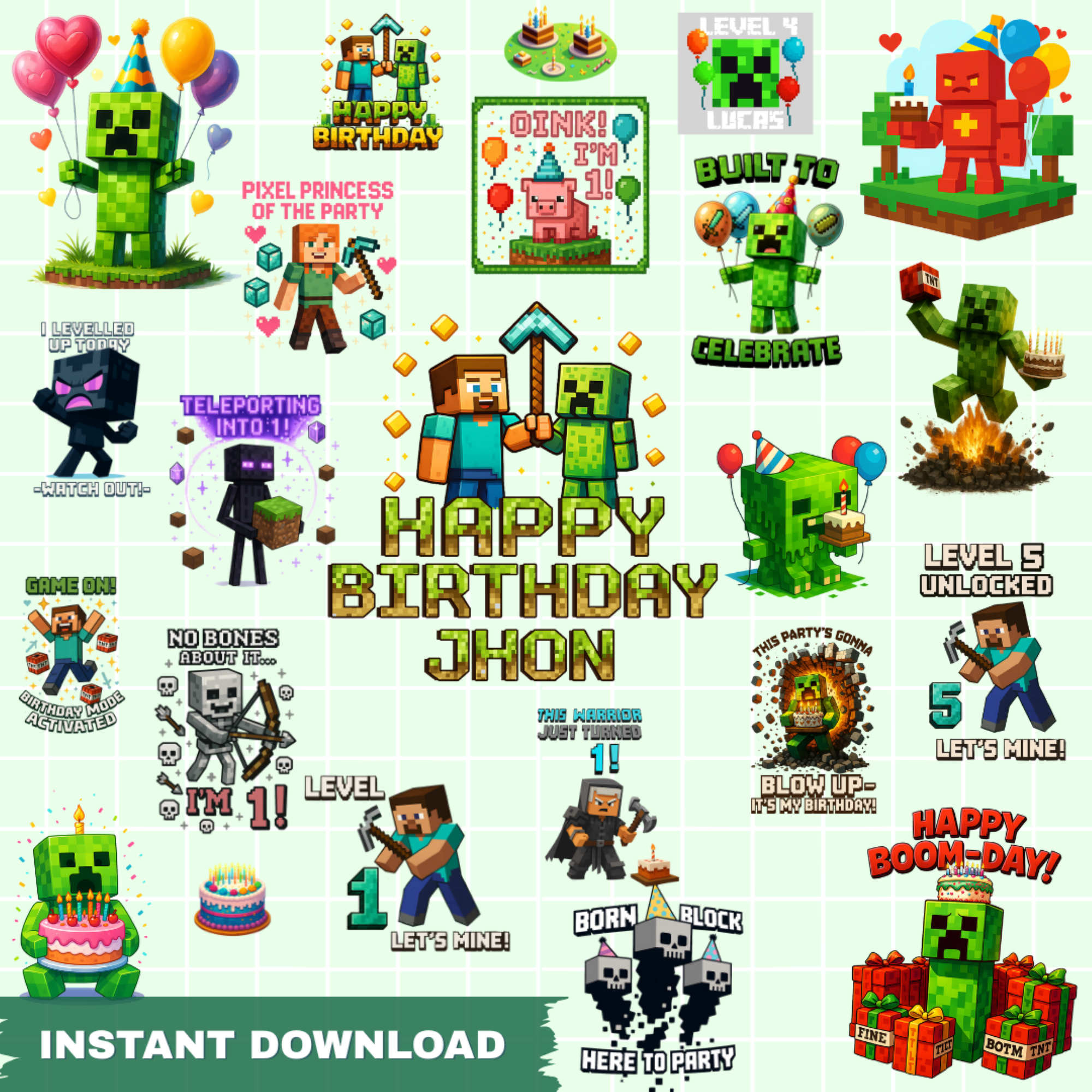 This massive collection is packed with over 60 high-quality designs, including colorful characters, fun birthday clipart, and editable elements for a custom name and age. Perfect for all your creative gaming projects, this bundle is a must-have for creating custom apparel, party decorations, and personalized items for any Minecraft fan.