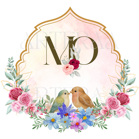 Royal Arch Frame with Love Birds – Luxurious floral arrangement with birds under a Mughal-style arch — perfect for regal invitations.