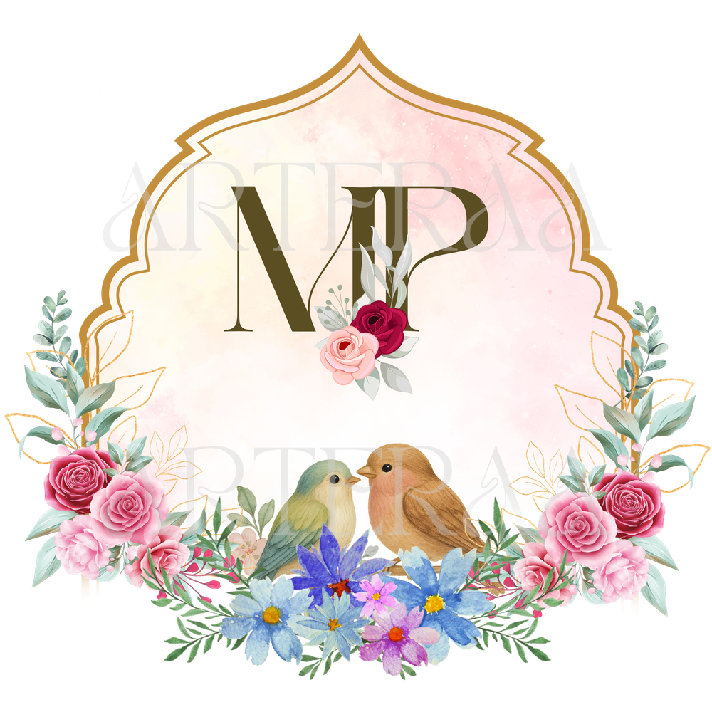 A: You will receive 5 high-resolution PNG files with transparent backgrounds featuring the selected couple initials (e.g., MP). The files are ready to use in digital or printed wedding materials.