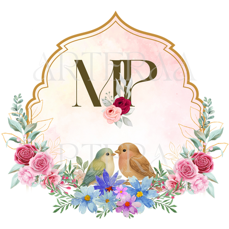 Royal Arch Frame with Love Birds – Luxurious floral arrangement with birds under a Mughal-style arch — perfect for regal invitations.