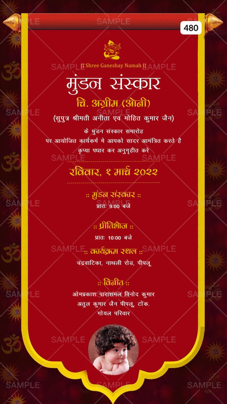 Mundan sanskar ceremony invitation card Canva Editable Template in hindi language with baby photo, golden frame as minimalistic theme design 480