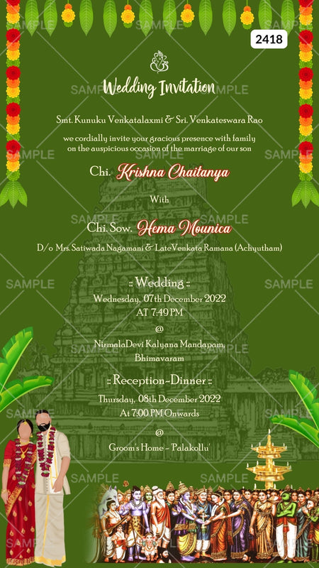 The temple Theme of the Hindu South Indian Namaste couple doodle digital invitation Canva Editable Template for a wedding ceremony in green background color. This e-invite editable template is perfectly suitable for the Telugu family and it's available in English language. It includes elements such as flowers, diya, leaves, temples, and people's images. This card design can be customized online for free in Canva, and you can edit the couple's name, date, time, function name and venue. You can also share your card easily via WhatsApp or email.