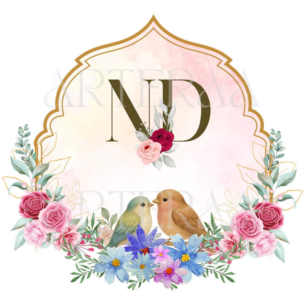 A: You will receive 5 high-resolution PNG files with transparent backgrounds featuring the selected couple initials (e.g., ND). The files are ready to use in digital or printed wedding materials.