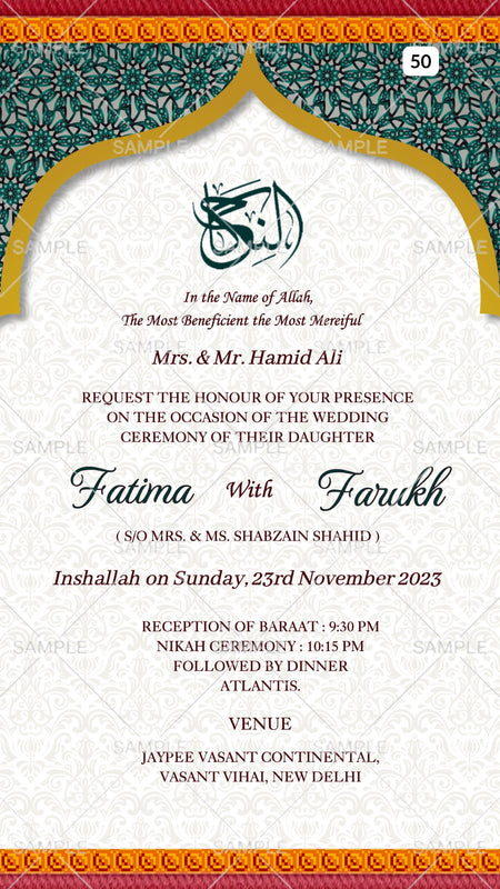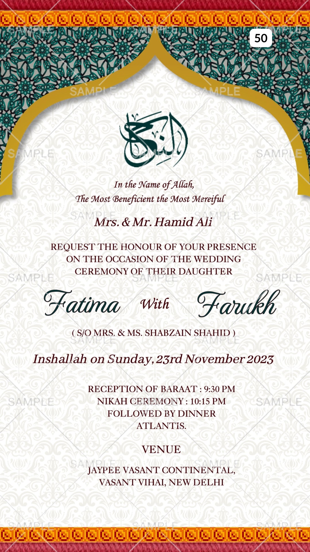Nikah ceremony invitation card Canva Editable Template of Muslim family in english language with Arch theme design 50