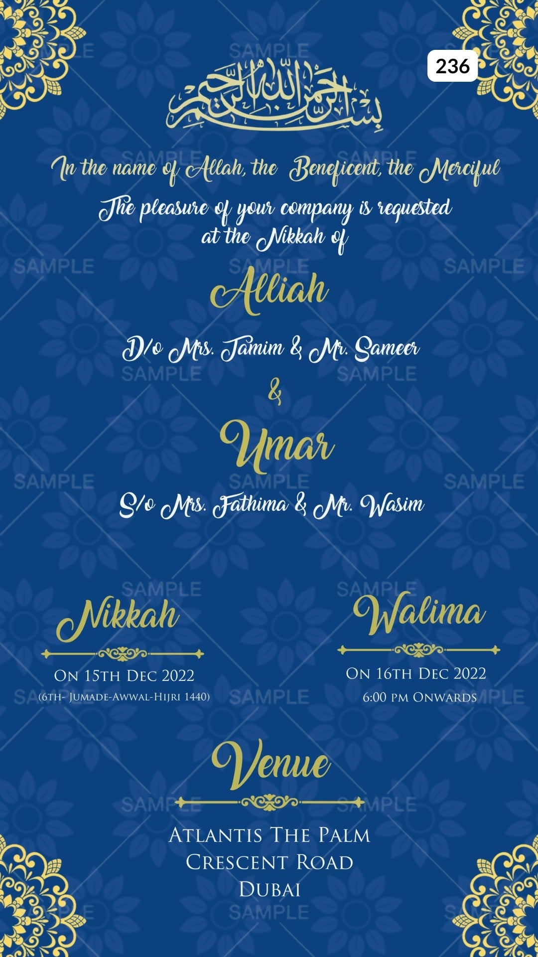 The Traditional Theme of the Islamic digital invitation Canva Editable for the Nikah marriage ceremony in a Navy Blue background color. This e-invite editable template is perfectly suitable for Muslim families and it's available in English language. It includes elements such as Bismillah Calligraphy, and golden frame. This card design can be customized online for free in Canva, and you can edit the name, date, time, function name and venue. You can also share your card easily via WhatsApp or email.
