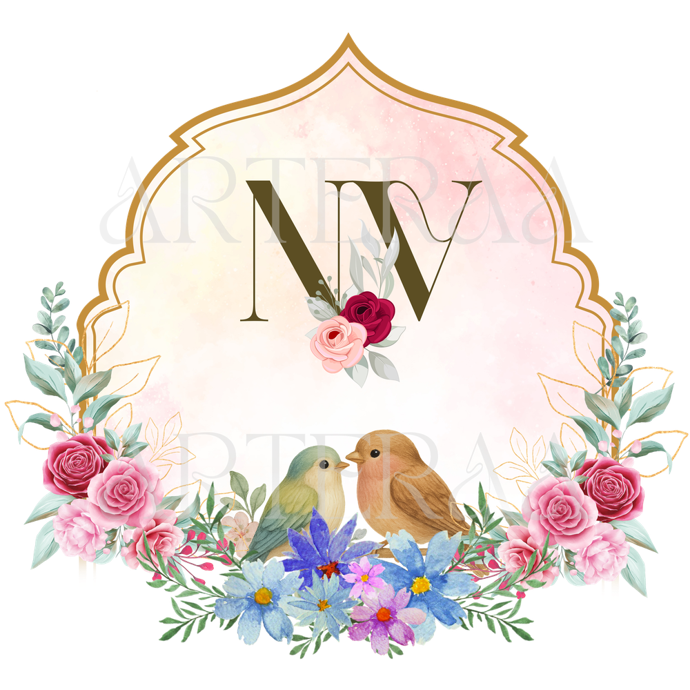 A: You will receive 5 high-resolution PNG files with transparent backgrounds featuring the selected couple initials (e.g., NV). The files are ready to use in digital or printed wedding materials.