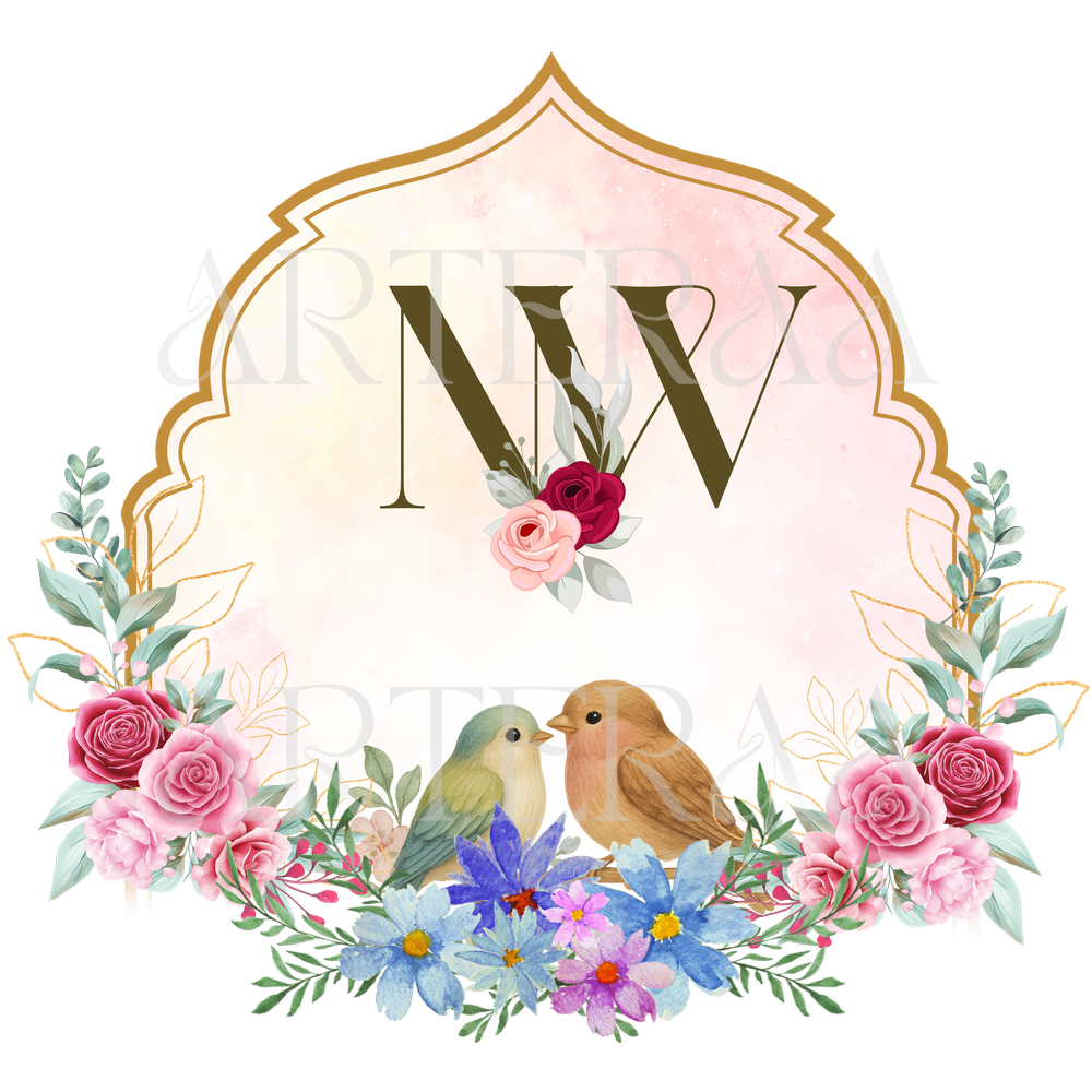 A: You will receive 5 high-resolution PNG files with transparent backgrounds featuring the selected couple initials (e.g., NW). The files are ready to use in digital or printed wedding materials.