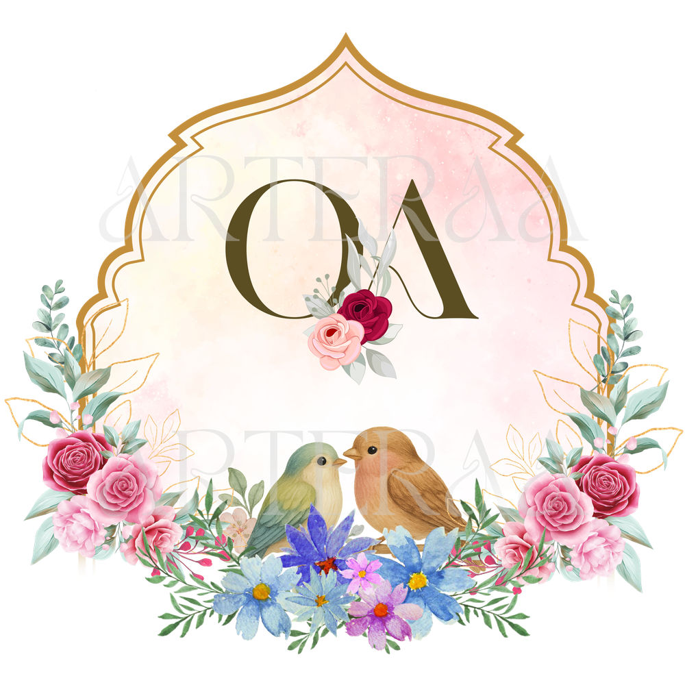 A: You will receive 5 high-resolution PNG files with transparent backgrounds featuring the selected couple initials (e.g., OA). The files are ready to use in digital or printed wedding materials.
