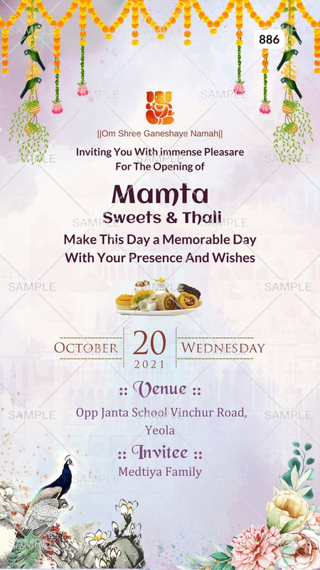 The traditional Theme of opening digital invitation Canva Template in pastel purpul background color. This Shop opening e-invite Editable Template is available in english language. This new shop opening card includes elements such as merigold garland, parrot, peacock, flowers, hanging pots and ganesha logo. This Editable Template design can be customized online for free in Canva, and you can edit the function name, date, time, venue, and regards. You can also share your card easily via WhatsApp or email.