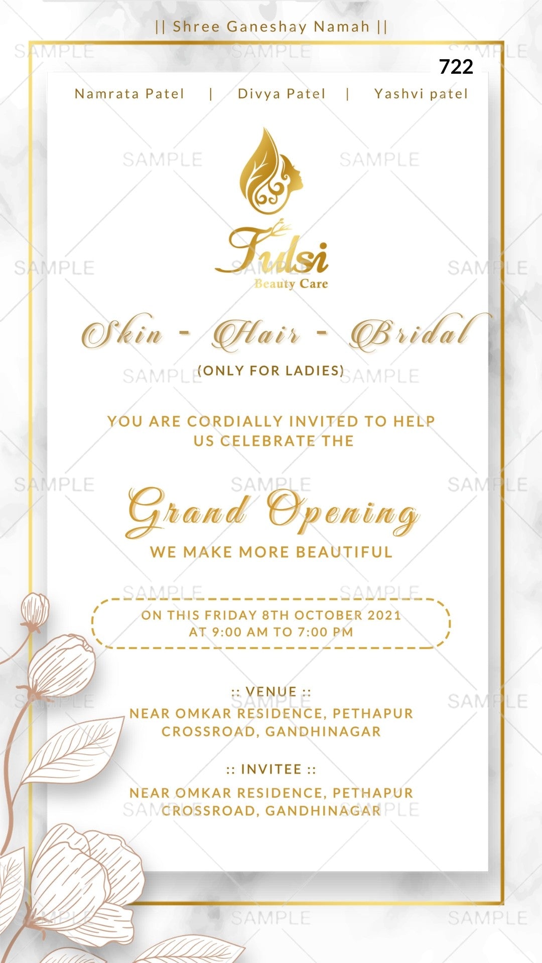 Opening invitation card Canva Editable Template in english language with frame, flower as minimalistic theme design 722