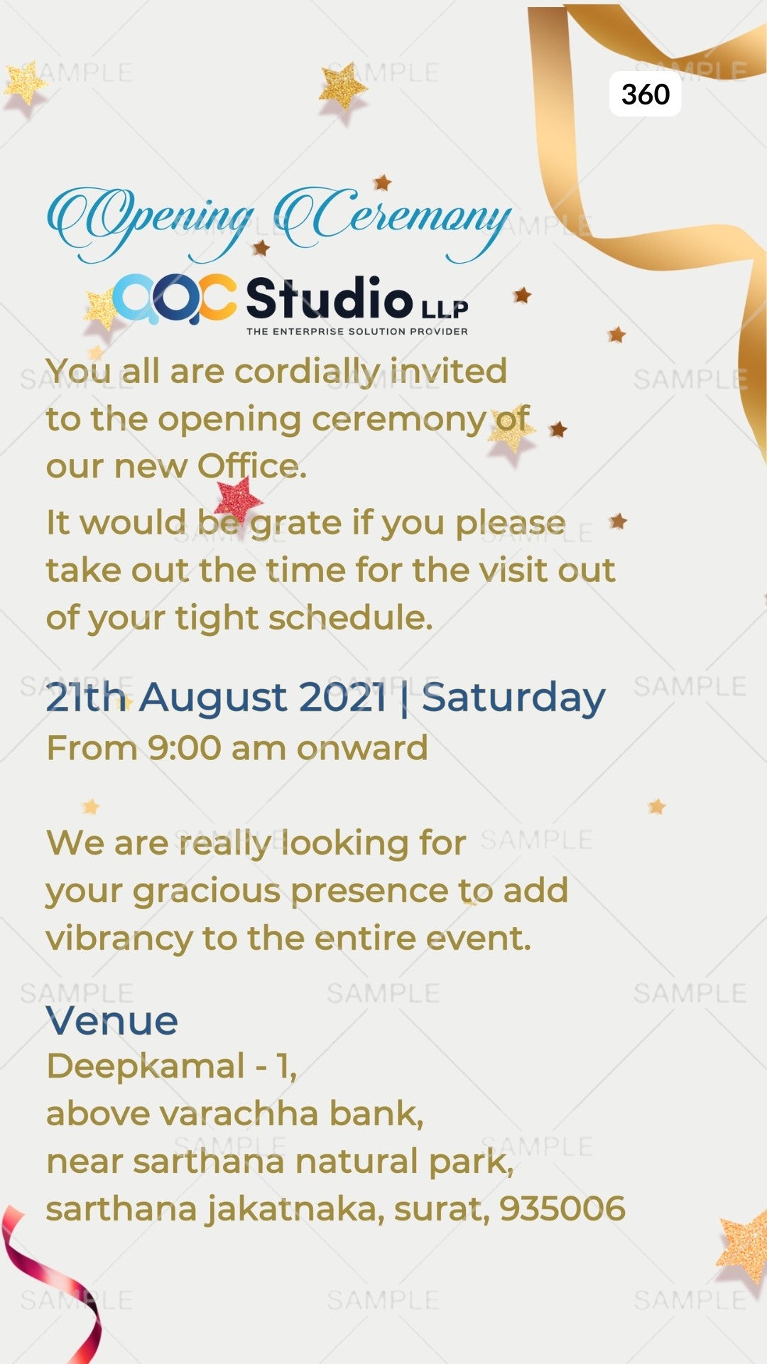 Opening invitation card Canva Editable Template in english language with ribin as sparkl theme design 360